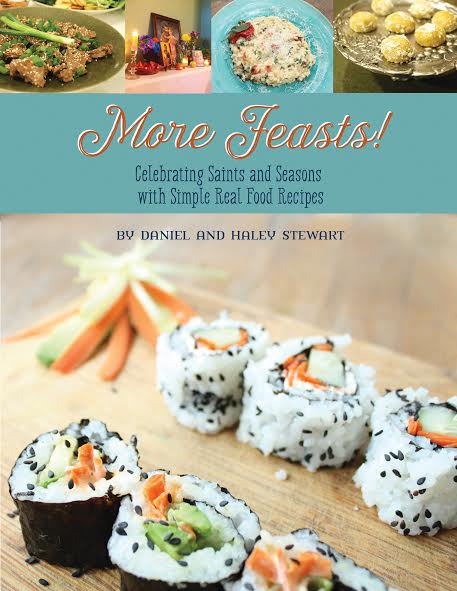 I wish I could invite myself over to the Stewart’s house, pour myself a cup of coffee, and sit at Daniel and Haley’s feet while they relay their wisdom. This Catholic (and much cooler) Brangelina are dynamite writers and fosterers of Catholic culture. You may have heard of their amazing ebook, Feasts!. It is a fabulous collection of real food recipes that correspond with various feast days through the liturgical calendar. The book also contains additional ideas for celebrating various feasts in the Church and reflections on different saints. The Stewarts recently released their follow up ebook, More Feasts! with even more ideas for liturgical living and simple, to-die for recipes like that sushi yo see on the cover.
